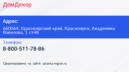 ДомДекор+ по адресу 660064, Красноярский край, Красноярск, Академика Вавилова, 1 ст48 в дальнейшем Организация, размещена в следующих категориях: