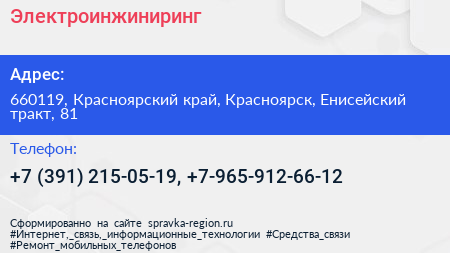 Электроинжиниринг по адресу 660119, Красноярский край, Красноярск, Енисейский тракт, 81 в дальнейшем Организация, размещена в следующих категориях: