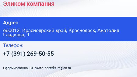Эликом, компания по адресу 660012, Красноярский край, Красноярск, Анатолия Гладкова, 4 в дальнейшем Организация, размещена в следующих категориях: