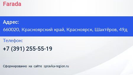Farada по адресу 660020, Красноярский край, Красноярск, Шахтёров, 49д в дальнейшем Организация, размещена в следующих категориях: