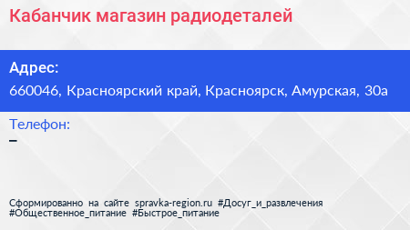 Кабанчик, магазин радиодеталей по адресу 660046, Красноярский край, Красноярск, Амурская, 30а в дальнейшем Организация, размещена в следующих категориях: