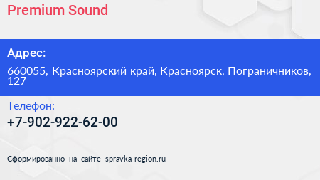 Premium Sound по адресу 660055, Красноярский край, Красноярск, Пограничников, 127 в дальнейшем Организация, размещена в следующих категориях: