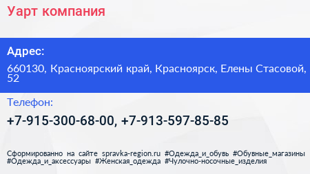 Уарт, компания по адресу 660130, Красноярский край, Красноярск, Елены Стасовой, 52 в дальнейшем Организация, размещена в следующих категориях: