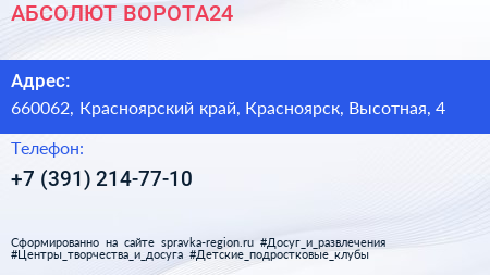 АБСОЛЮТ. ВОРОТА24 по адресу 660062, Красноярский край, Красноярск, Высотная, 4 в дальнейшем Организация, размещена в следующих категориях: