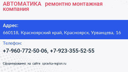 АВТОМАТИКА+, ремонтно-монтажная компания по адресу 660118, Красноярский край, Красноярск, Урванцева, 16 в дальнейшем Организация, размещена в следующих категориях: