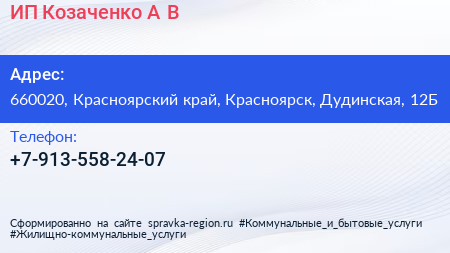 ИП Козаченко А.В. по адресу 660020, Красноярский край, Красноярск, Дудинская, 12Б в дальнейшем Организация, размещена в следующих категориях: