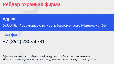 Рейдер, охранная фирма по адресу 660048, Красноярский край, Красноярск, Маерчака, 65 в дальнейшем Организация, размещена в следующих категориях:
