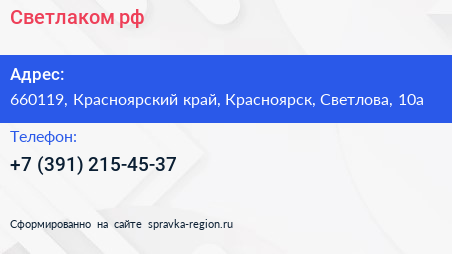 Светлаком.рф по адресу 660119, Красноярский край, Красноярск, Светлова, 10а в дальнейшем Организация, размещена в следующих категориях: