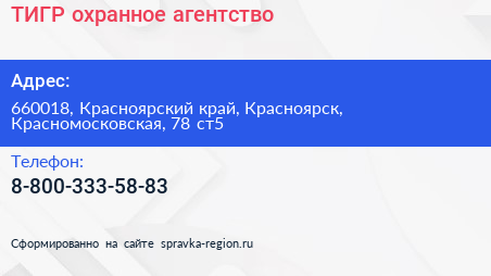ТИГР, охранное агентство по адресу 660018, Красноярский край, Красноярск, Красномосковская, 78 ст5 в дальнейшем Организация, размещена в следующих категориях: