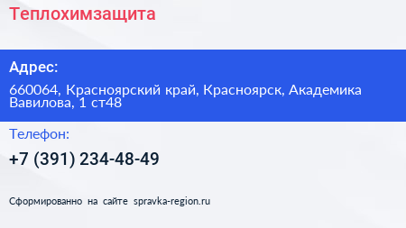 Теплохимзащита по адресу 660064, Красноярский край, Красноярск, Академика Вавилова, 1 ст48 в дальнейшем Организация, размещена в следующих категориях: