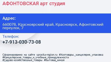 АФОНТОВСКАЯ, арт-студия по адресу 660078, Красноярский край, Красноярск, Афонтовский переулок, 7 в дальнейшем Организация, размещена в следующих категориях: