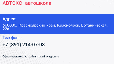 АВТЭКС+, автошкола по адресу 660030, Красноярский край, Красноярск, Ботаническая, 22а в дальнейшем Организация, размещена в следующих категориях: