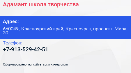 Адамант, школа творчества по адресу 660049, Красноярский край, Красноярск, проспект Мира, 30 в дальнейшем Организация, размещена в следующих категориях: