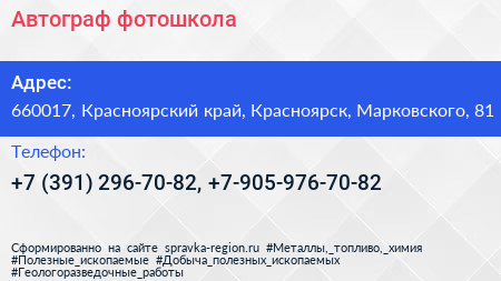 Автограф, фотошкола по адресу 660017, Красноярский край, Красноярск, Марковского, 81 в дальнейшем Организация, размещена в следующих категориях: