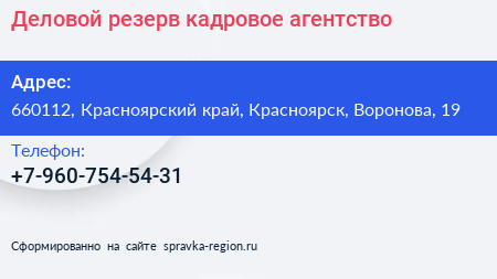 Деловой резерв, кадровое агентство по адресу 660112, Красноярский край, Красноярск, Воронова, 19 в дальнейшем Организация, размещена в следующих категориях: