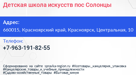 Детская школа искусств, пос. Солонцы по адресу 660015, Красноярский край, Красноярск, Центральная, 10 в дальнейшем Организация, размещена в следующих категориях: