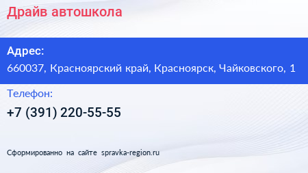 Драйв, автошкола по адресу 660037, Красноярский край, Красноярск, Чайковского, 1 в дальнейшем Организация, размещена в следующих категориях: