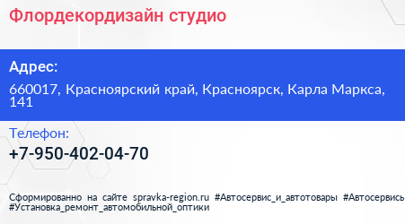 Флордекордизайн-студио по адресу 660017, Красноярский край, Красноярск, Карла Маркса, 141 в дальнейшем Организация, размещена в следующих категориях: