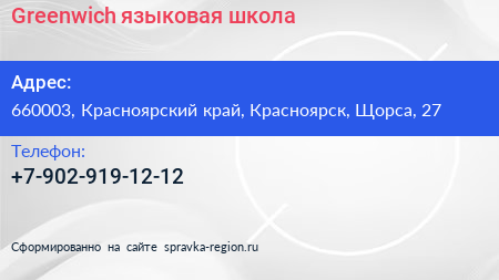 Greenwich, языковая школа по адресу 660003, Красноярский край, Красноярск, Щорса, 27 в дальнейшем Организация, размещена в следующих категориях: