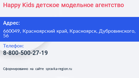 Happy Kids, детское модельное агентство по адресу 660049, Красноярский край, Красноярск, Дубровинского, 56 в дальнейшем Организация, размещена в следующих категориях: