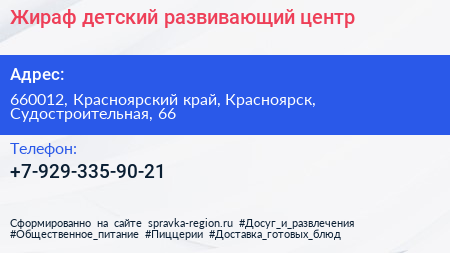 Жираф, детский развивающий центр по адресу 660012, Красноярский край, Красноярск, Судостроительная, 66 в дальнейшем Организация, размещена в следующих категориях: