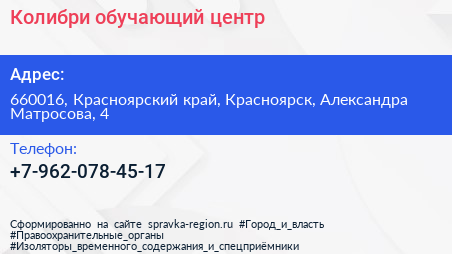 Колибри, обучающий центр по адресу 660016, Красноярский край, Красноярск, Александра Матросова, 4 в дальнейшем Организация, размещена в следующих категориях: