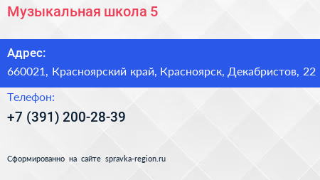 Музыкальная школа №5 по адресу 660021, Красноярский край, Красноярск, Декабристов, 22 в дальнейшем Организация, размещена в следующих категориях: