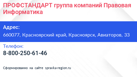 ПРОФСТАНДАРТ, группа компаний Правовая Информатика по адресу 660077, Красноярский край, Красноярск, Авиаторов, 33 в дальнейшем Организация, размещена в следующих категориях:
