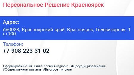 Персональное Решение Красноярск по адресу 660028, Красноярский край, Красноярск, Телевизорная, 1 ст100 в дальнейшем Организация, размещена в следующих категориях: