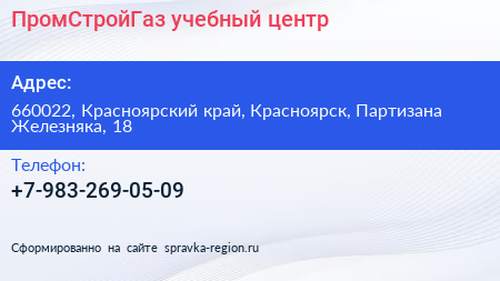 ПромСтройГаз, учебный центр по адресу 660022, Красноярский край, Красноярск, Партизана Железняка, 18 в дальнейшем Организация, размещена в следующих категориях: