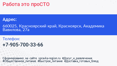 Работа это проСТО по адресу 660025, Красноярский край, Красноярск, Академика Вавилова, 27а в дальнейшем Организация, размещена в следующих категориях: