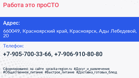 Работа это проСТО по адресу 660049, Красноярский край, Красноярск, Ады Лебедевой, 20 в дальнейшем Организация, размещена в следующих категориях: