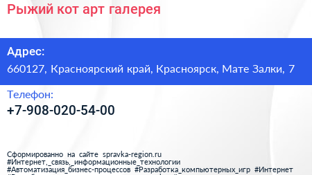 Рыжий кот, арт-галерея по адресу 660127, Красноярский край, Красноярск, Мате Залки, 7 в дальнейшем Организация, размещена в следующих категориях: