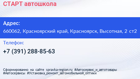 СТАРТ, автошкола по адресу 660062, Красноярский край, Красноярск, Высотная, 2 ст2 в дальнейшем Организация, размещена в следующих категориях: