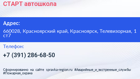 СТАРТ, автошкола по адресу 660028, Красноярский край, Красноярск, Телевизорная, 1 ст7 в дальнейшем Организация, размещена в следующих категориях: