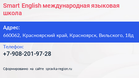 Smart English, международная языковая школа по адресу 660062, Красноярский край, Красноярск, Вильского, 18д в дальнейшем Организация, размещена в следующих категориях: