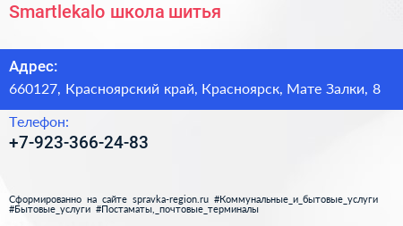 Smartlekalo, школа шитья по адресу 660127, Красноярский край, Красноярск, Мате Залки, 8 в дальнейшем Организация, размещена в следующих категориях: