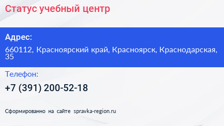Статус, учебный центр по адресу 660112, Красноярский край, Красноярск, Краснодарская, 35 в дальнейшем Организация, размещена в следующих категориях: