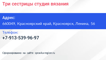 Три сестрицы, студия вязания по адресу 660049, Красноярский край, Красноярск, Ленина, 56 в дальнейшем Организация, размещена в следующих категориях: