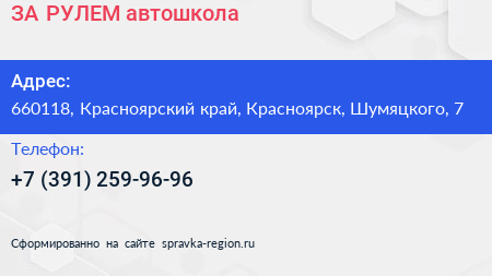 ЗА РУЛЕМ, автошкола по адресу 660118, Красноярский край, Красноярск, Шумяцкого, 7 в дальнейшем Организация, размещена в следующих категориях: