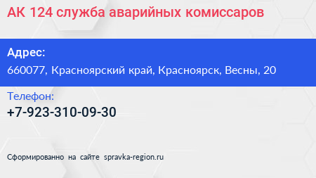 АК-124, служба аварийных комиссаров по адресу 660077, Красноярский край, Красноярск, Весны, 20 в дальнейшем Организация, размещена в следующих категориях: