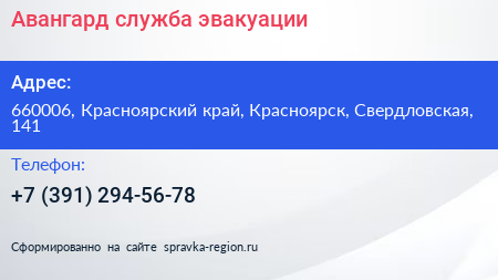 Авангард, служба эвакуации по адресу 660006, Красноярский край, Красноярск, Свердловская, 141 в дальнейшем Организация, размещена в следующих категориях:
