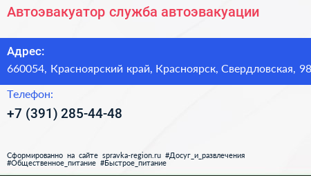 Автоэвакуатор, служба автоэвакуации по адресу 660054, Красноярский край, Красноярск, Свердловская, 98 в дальнейшем Организация, размещена в следующих категориях:
