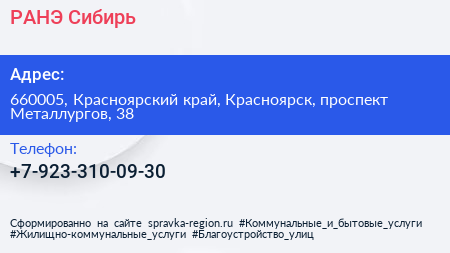 РАНЭ-Сибирь по адресу 660005, Красноярский край, Красноярск, проспект Металлургов, 38 в дальнейшем Организация, размещена в следующих категориях:
