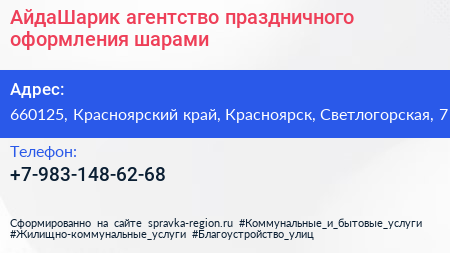 АйдаШарик, агентство праздничного оформления шарами по адресу 660125, Красноярский край, Красноярск, Светлогорская, 7 в дальнейшем Организация, размещена в следующих категориях: