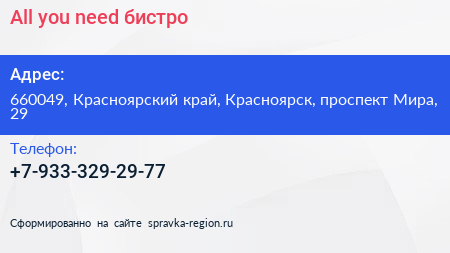 All you need, бистро по адресу 660049, Красноярский край, Красноярск, проспект Мира, 29 в дальнейшем Организация, размещена в следующих категориях: