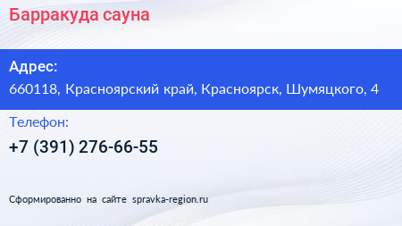 Барракуда, сауна по адресу 660118, Красноярский край, Красноярск, Шумяцкого, 4 в дальнейшем Организация, размещена в следующих категориях: