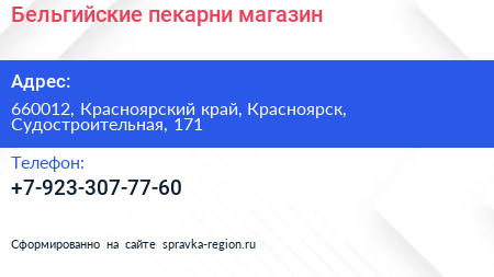 Бельгийские пекарни, магазин по адресу 660012, Красноярский край, Красноярск, Судостроительная, 171 в дальнейшем Организация, размещена в следующих категориях: