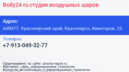 Bolly24.ru, студия воздушных шаров по адресу 660077, Красноярский край, Красноярск, Авиаторов, 21 в дальнейшем Организация, размещена в следующих категориях: