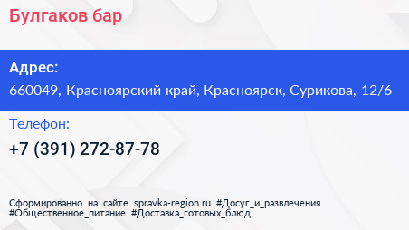 Булгаков, бар по адресу 660049, Красноярский край, Красноярск, Сурикова, 12/6 в дальнейшем Организация, размещена в следующих категориях: